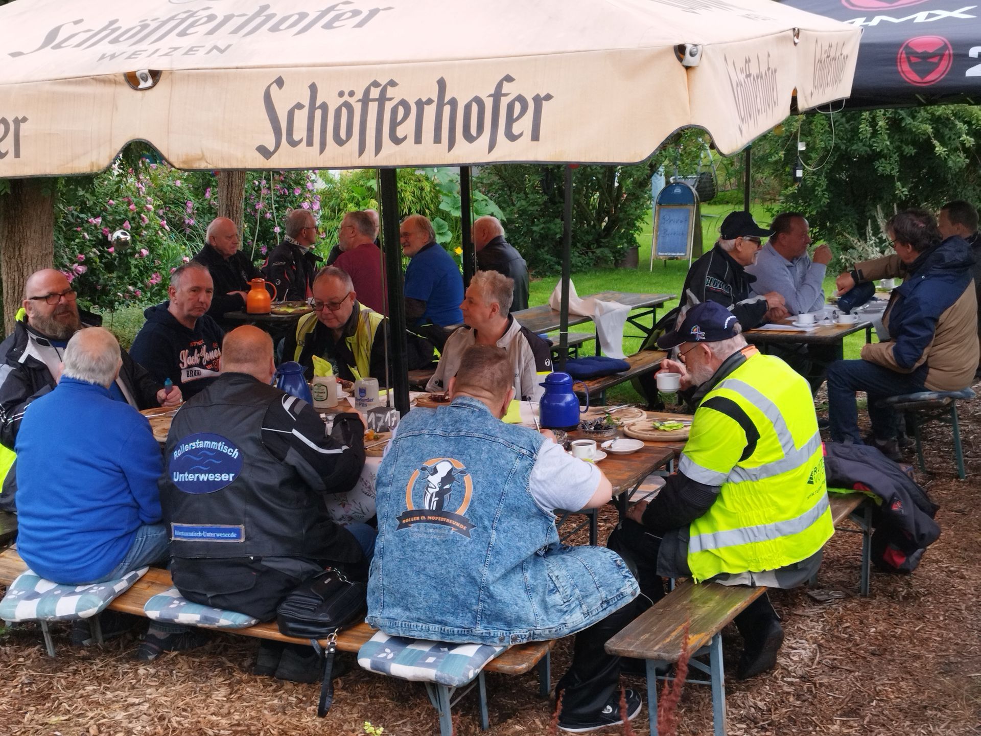 Mit Frank an der Spitze erreichten wir schließlich das Weserdorf im schönen Rinteln – ein herrlicher Ort zum Verweilen. Dort nutzten wir die Gelegenheit, uns mit Schnitzel, Pommes, Bratwurst und anderen Köstlichkeiten zu stärken, selbstverständlich begleitet von gekühlten, alkoholfreien Getränken.