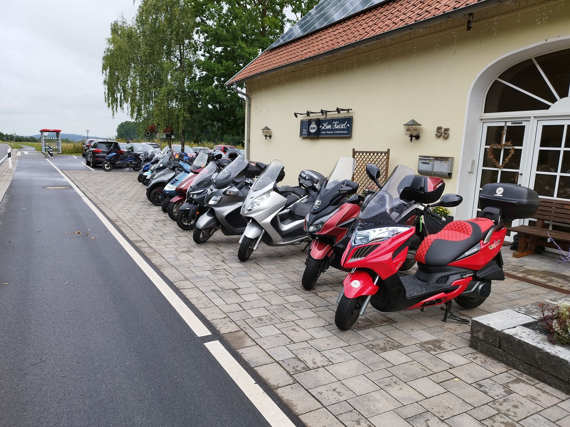 Nachdem bereits die ersten Kilometer zurückgelegt waren, konnten sich alle nach Belieben mit Kaffee, Brötchen und Gebäck stärken. Unsere nun erweiterte Rollerkolonne wurde im Anschluss von Ulrike sicher zum Motorradcafé „Die Kurve“ geführt.